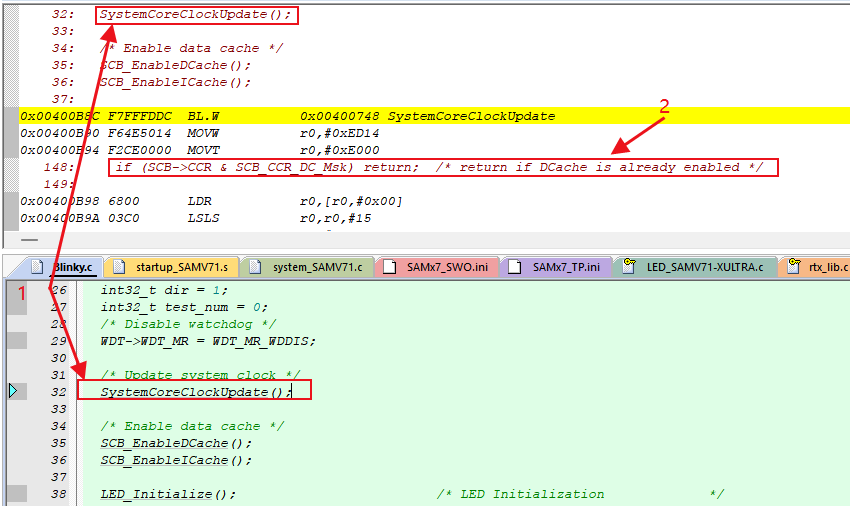 3、從Disassembly窗口中可以看到程序的運行順序是怎么樣的。如圖4-3中,當程序運行到“SystemCoreClockUpdate();”這個語句的時候,在Disassembly窗口中就可以看到,繼續執行程序后,會執行該函數中的“if (SCB->CCR & SCB_CCR_DC_Msk) return; ”語句。