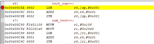 1、在Disassembly窗口中,包含著程序語句以及對應語句的所需要執行的匯編指令。如圖4-1中可以看到test_num++這個語句對應匯編語句。