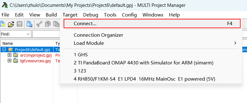 1)、進入項目管理界面,選擇<Target >--<Connect...>,進入連接選項界面。