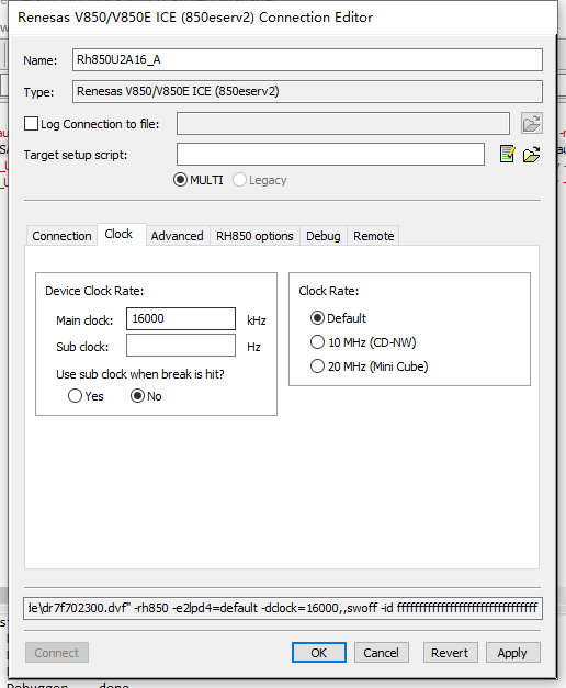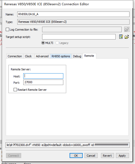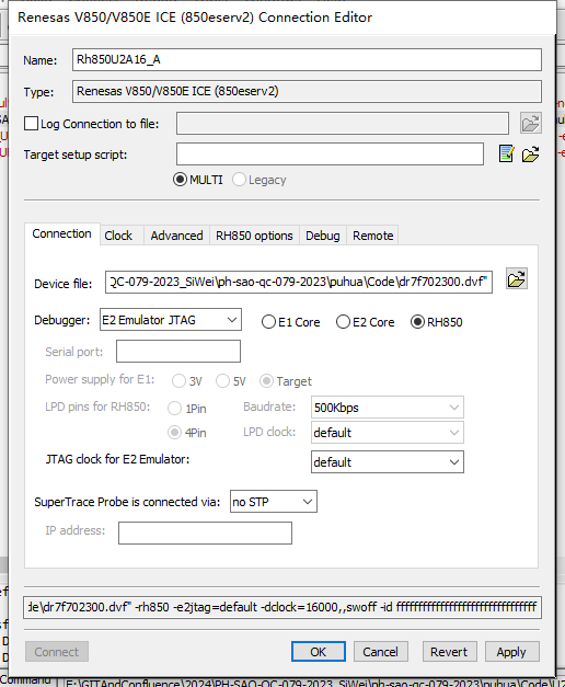 3)、進入”Connection“界面,在”Device file“處選擇對應芯片的.dvf文件,”Debugger“處首先選擇E1還是E2仿真器,JTAG接口,選擇<RH850>內核。其余默認即可。