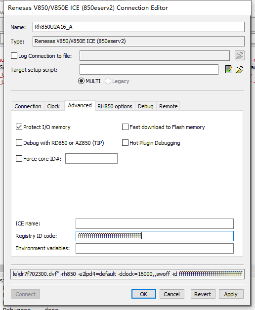 5)、進入”Advanced“界面,選擇<Protect I/O memory>保護內存,在”Registry ID code “處填寫(E2仿真器填寫64個f,E1仿真器填寫32個f),其余默認即可。