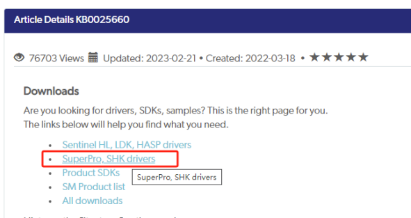 2、解決方法就是在加密狗的驅動官網下載https://supportportal.thalesgroup.com/csm/?id=sentinel 在網頁上找到 Drivers and Downloads -> SuperPro, SHK drivers (如圖4-2-1和圖4-2-2),然后下載Sentinel Protection Installer Version 7.5.0 (Installer Only)這個版本的驅動程序進行安裝。