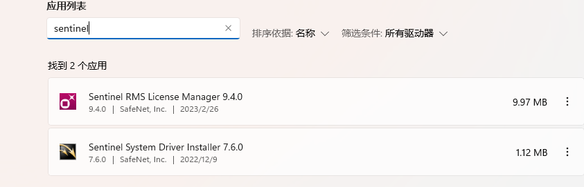 3、安裝前需要先卸載之前安裝過的驅動程序。可以在電腦的應用列表中搜索sentinel,找到驅動程序進行卸載。(如圖4-3)