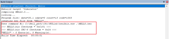 (3)、然后,去重新Build工程,就可以在Build output窗口中看到命令執行的情況(如圖4-1-3)。并且在hex文件的位置看到bin文件的生成(如圖4-1-4)。