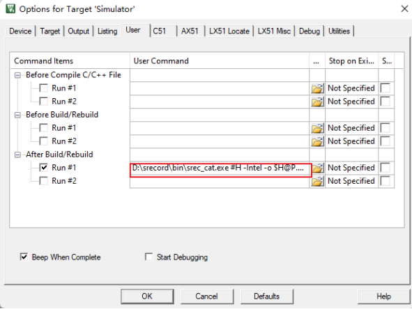 (2)、安裝完成后,也是在PK51中進入到options->User欄中,在After Build/Rebuild的輸入欄中,輸入命令"D:srecordbinsrec_cat.exe #H -Intel -o $H@P.bin -Binary"(如圖2-2-1) 。命令解析是指定srec_cat.exe路徑,#H表示期望輸入的是hex文件,-Intel表示指定應將輸入文件解釋為Intel HEX文件,-o表示輸出參數,$H@P.bin表示輸出為bin文件。-Binary表示指定應將輸出文件生成為二進制文件。