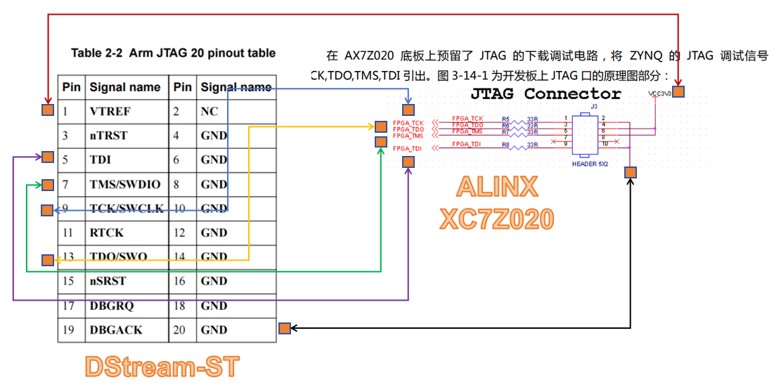 1.根據(jù)DStream-ST與ALINX 開發(fā)板的JTAG調(diào)試接口的定義,確認JTAG調(diào)試接口的引腳連接,如圖3-1所示: