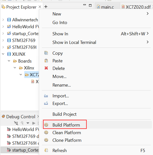 1.選中“XC7Z020”,選擇“Build Platform”編譯平臺,如圖4-1所示: