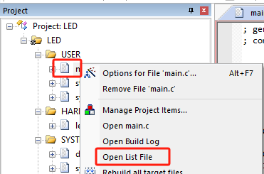1)、在Project窗口中,選中對(duì)應(yīng)的文件,右鍵選擇打開list文件(如圖4-1)。