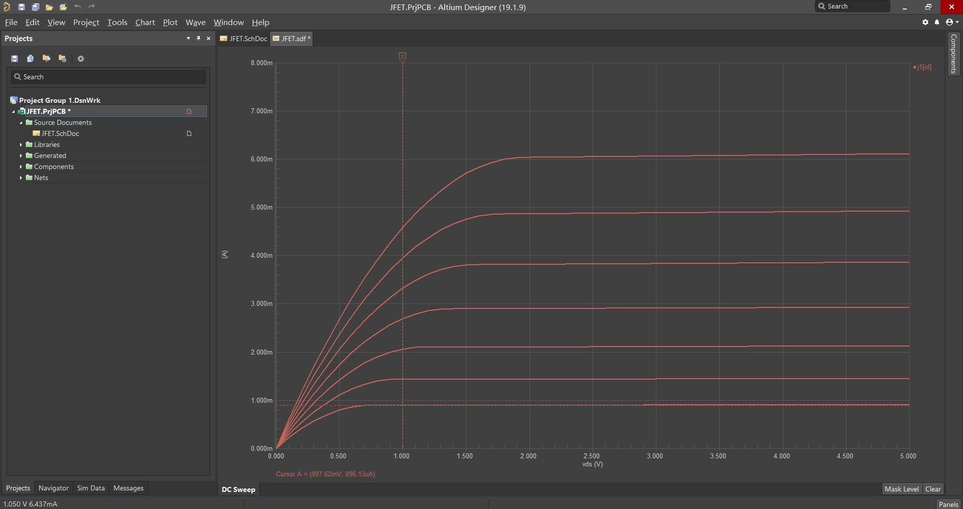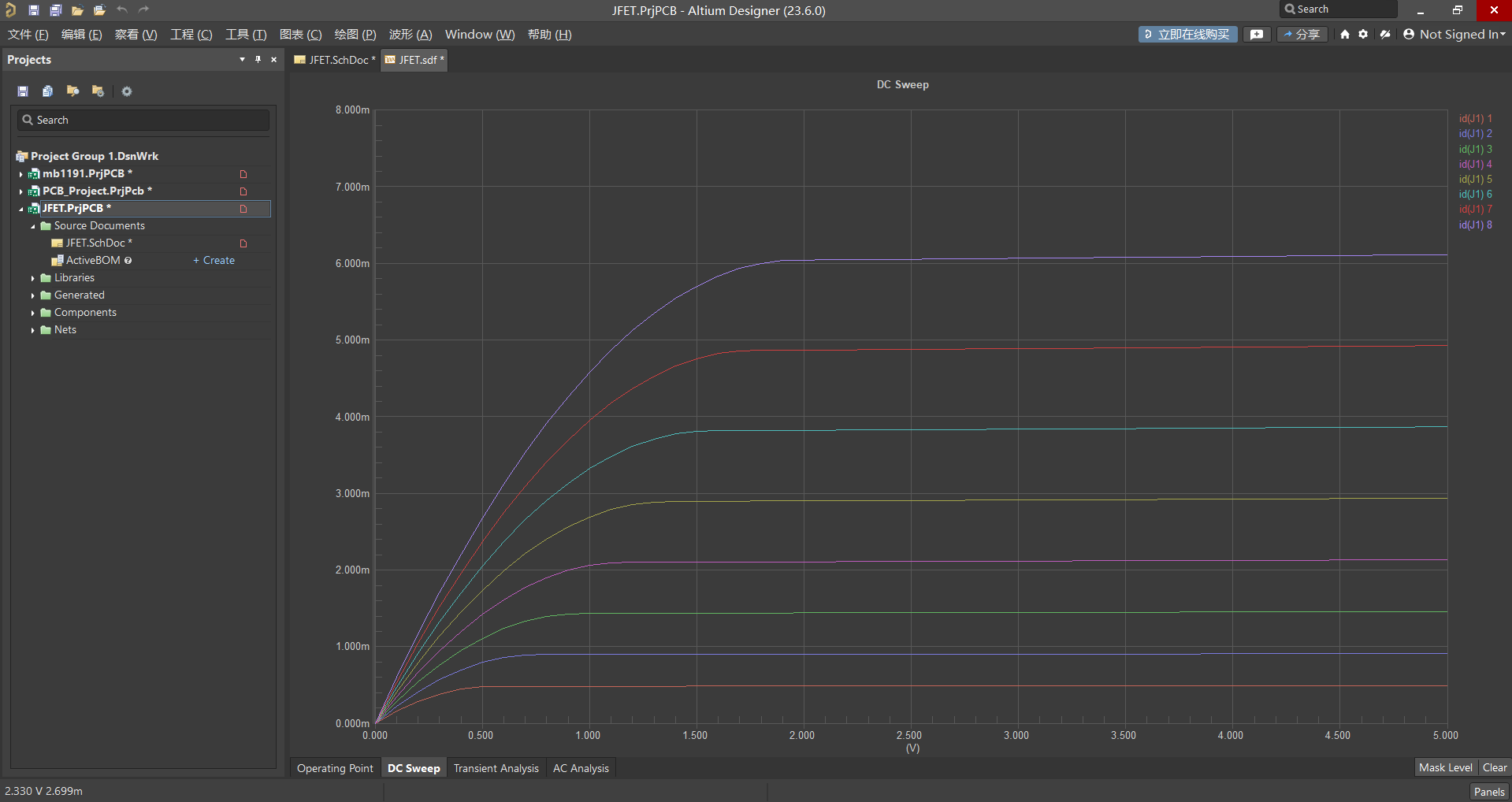 2、舊版仿真出的曲線,針對 VGS 不同的條件,每條曲線顏色顯示相同,使用探測時,顯示的數值為最底下的曲線數據。