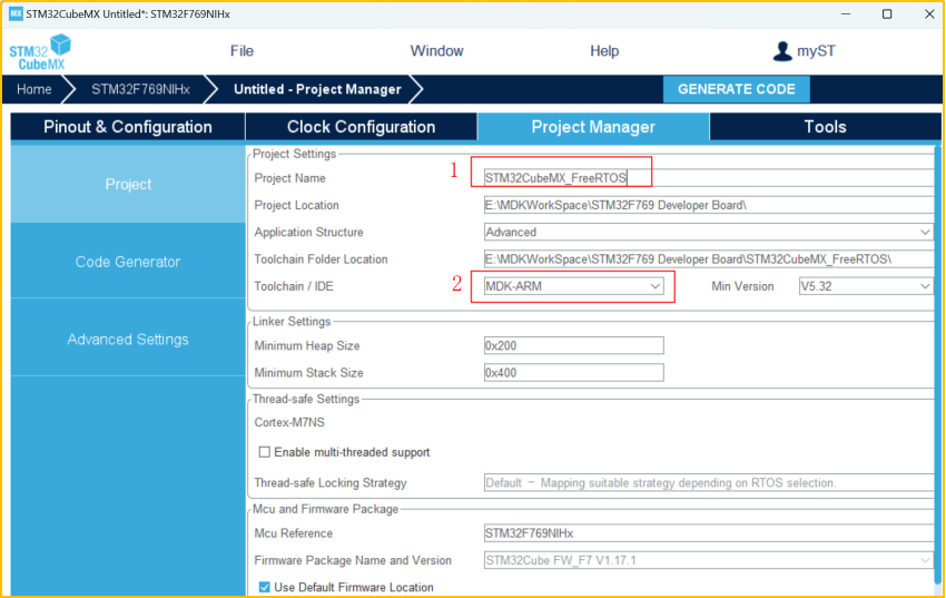 3. 選擇“Project Manager”,輸入項(xiàng)目名稱,并選擇工具鏈名稱,如下圖3-3所示: