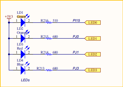 4. 由于在項(xiàng)目中需要用于LED燈的控制,打開發(fā)板關(guān)于LED的原理圖,如下圖3-4所示: