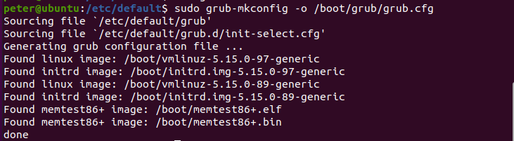 (4)、修改保存好后,通過執行“sudo grub-mkconfig -o /boot/grub/grub.cfg”命令,將修改后的內容添加到配置文件中。(如圖4-2-4)