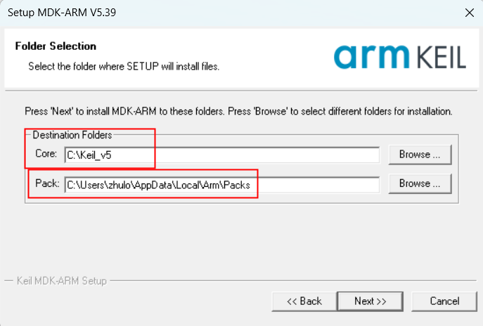 Core處選擇MDK的安裝路徑,Pack處選擇MDK相關支持包的安裝路徑(建議默認),再點擊Next。