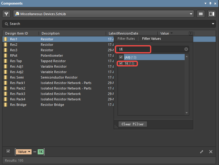 5. 在搜索框中輸入 1K,勾選 1K,這時(shí)候就會(huì)顯示所有值為 1K 的器件;