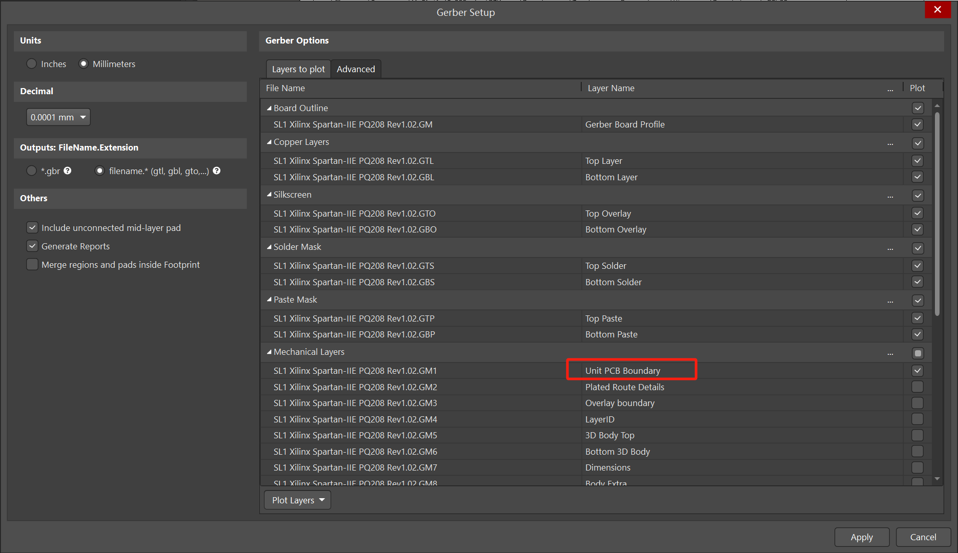 另外我們在輸出設(shè)置的時候,除了輸出基礎(chǔ)的一些層信息,還需要特別注意一下這里的板框?qū)樱鐖D中我的板框?qū)邮墙小癠nit PCB Boundary”輸出后綴是.GM1,這樣以確保在華秋DFM中可以看到板框。