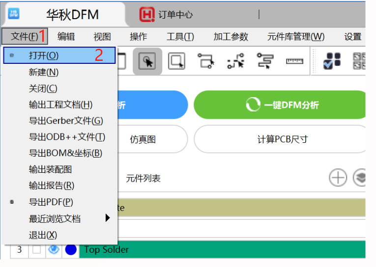 2、接下來是導(dǎo)入華秋DFM,打開軟件選擇文件-打開,然后選擇剛才保存Gerber的文件夾,將里面全部的文件導(dǎo)入進去。