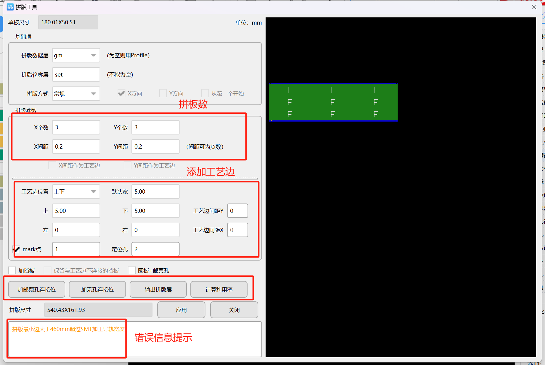 3、根據(jù)自己要拼板的數(shù)量和對板廠工藝邊、Mark點、定位孔的要求進行填寫。這里舉例V割拼板,大概會切除0.2mm的板,間距可以稍微多留一點,還需要注意的是,對話框最下面有錯誤信息的提示,否則拼板在制作工藝上會出現(xiàn)問題。