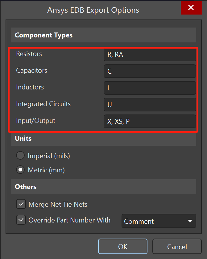 (2)、由于在輸出EDB文件時,有一個參數設置,在里面定義了每種器件所用的符號是什么,比如說電容用C表示,會根據所定義的符號去讀取對應的Dedignator代表的值,如果comment值單位不對應相應的符號就會發生數值錯亂,由于在原理圖里定義了電感的符號卻賦予了電阻值,所以在仿真里就讀取到了電感值而不會讀取下面定義的電阻值。規范使用元器件就可避免此問題。