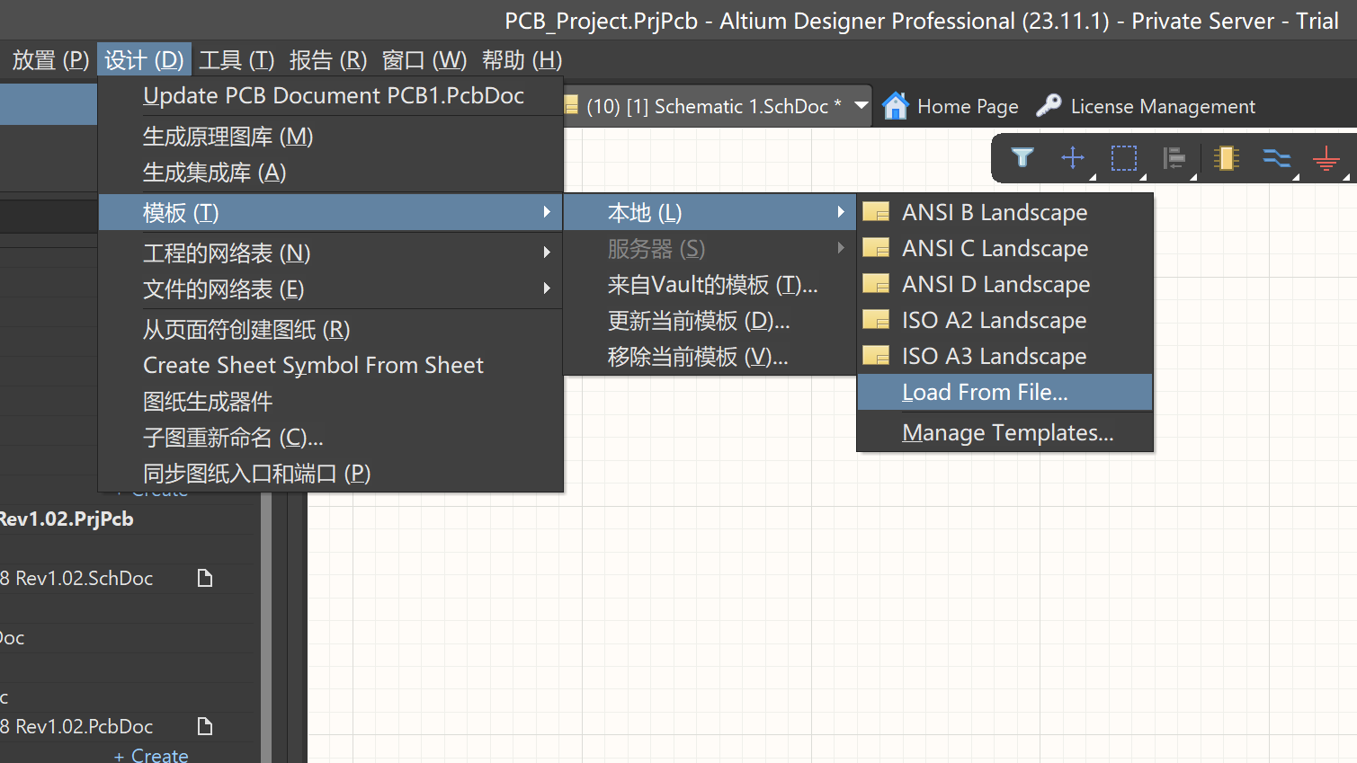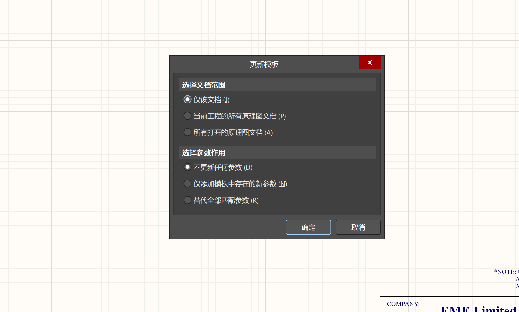 2)、將更改后的模板文件導入到原理圖中【設計】->【模板】->【本地】->【Load From File...】,在彈出的頁面框里選中更改后的模板文件打開,在彈出的【更新模板】頁面框選擇要更改的文檔范圍和參數作用,“僅該文檔”:只有當前原理圖會產生更改,"當前工程的所有原理圖文檔"當前工程的所有原理圖文檔都會更改,“所有打開的原理圖文檔”所有打開的原理圖文檔都會產生更改。