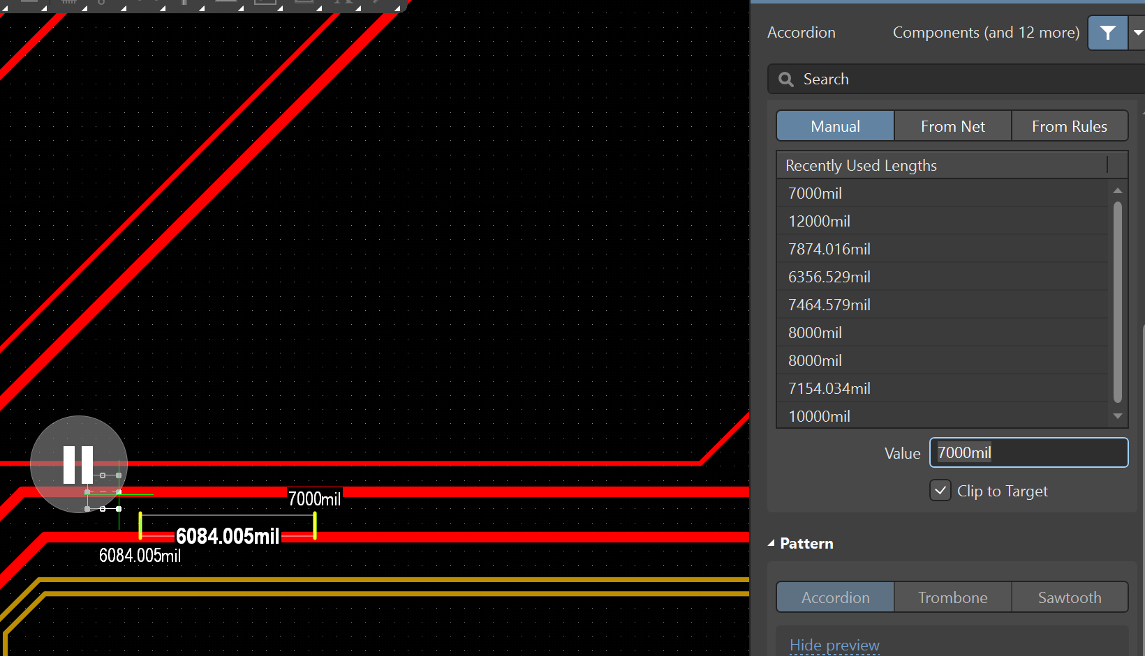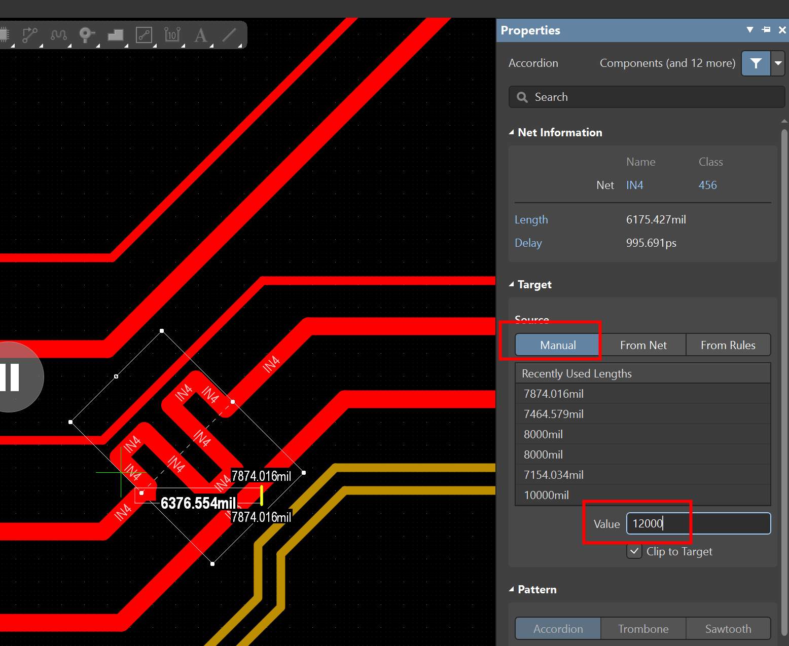 1)、使用等長調(diào)節(jié)命令后選中要調(diào)節(jié)的線,出現(xiàn)長度浮標,此時按下“Tab”鍵,打開等長線調(diào)節(jié)屬性窗口。在Source處有三個選項,分別是Manual(手動輸入長度),F(xiàn)rom Net(以某個網(wǎng)絡(luò)的長度為目標),F(xiàn)rom Rules(依據(jù)設(shè)置的規(guī)則)。