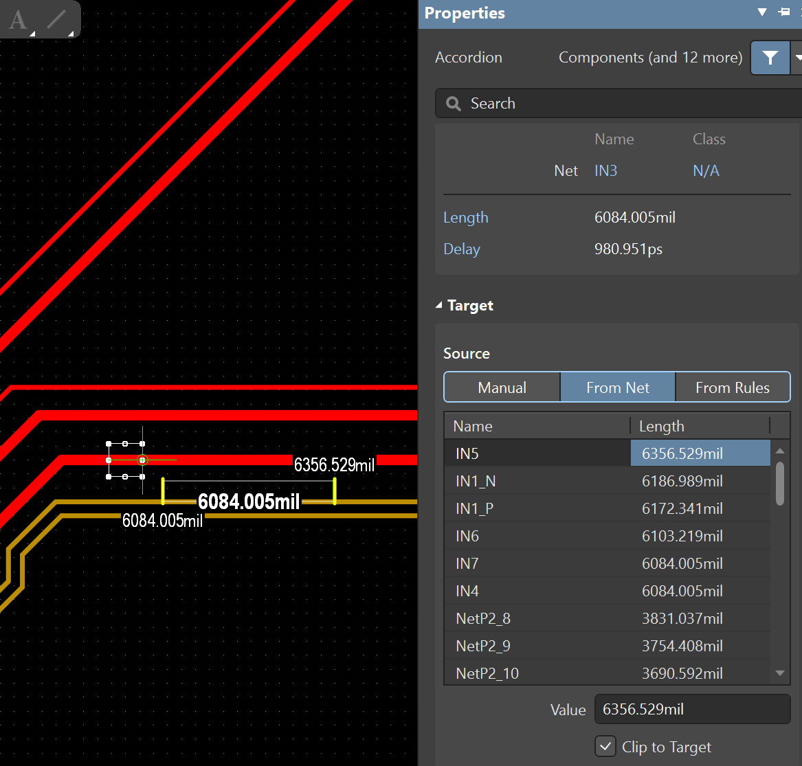 4)、當選擇From Net時,會列出當前PCB上所有已布好的線以及它們的長度,選擇需要遵循的目標網(wǎng)絡(luò),此時選擇IN5,其長度為6356.529。