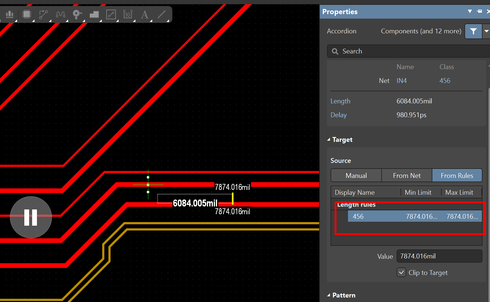 6)、選擇From Rules,等長線調(diào)節(jié)的目標將遵循設(shè)置的規(guī)則,需在等長規(guī)則中以目標網(wǎng)絡(luò)先設(shè)置一條規(guī)則。設(shè)置規(guī)則后才能在From Rules中看到長度規(guī)則,將其選中后,就能以規(guī)則設(shè)定目標進行等長線調(diào)節(jié)。