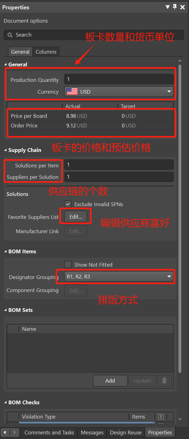 ○ Production Quantity是定義電路板的需求數量,Currency為顯示組件價格的首選單位