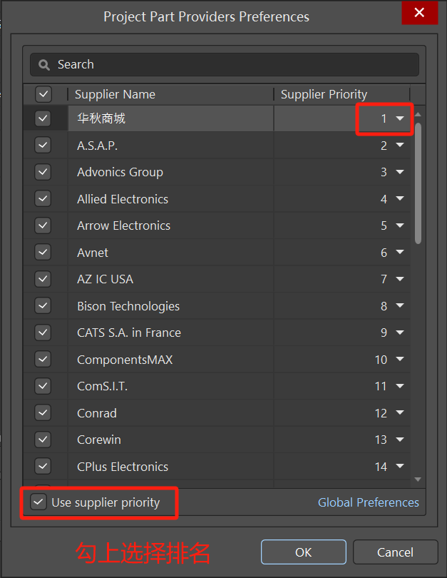 P.S. 另外,供應商信息可以配置,通過Altium Parts Provider提供供應鏈數據。Altium Parts Provider可獲取大量遍布全球的元器件供應商的詳細信息。一組可用供應商可配置為兩個層次: