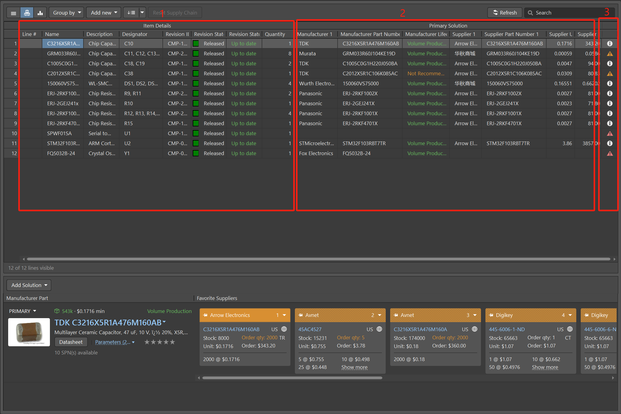 2. Solutions——排名最高的制造商和來自供應鏈的供應商。解決方案(制造商元件)的數量和各解決方案供應商的數量均可在ActiveBOM的屬性面板中進行配置——這些信息均通過供應商名稱的立體彩色旗幟標明。排名是自動的,但也可以手動設定,如上文“供應鏈”部分所述。