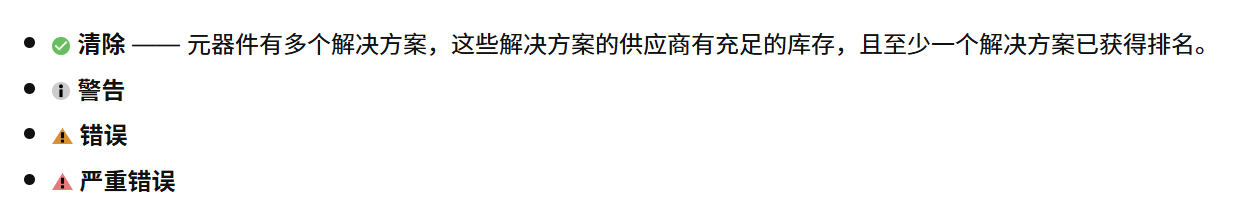 3. BOM Status——表明與每個元器件相關的當前風險。將鼠標懸停在圖標上了解描述,或者在屬性面板中啟用BOM Staus列來顯示描述。詳細的狀態信息后面會講。