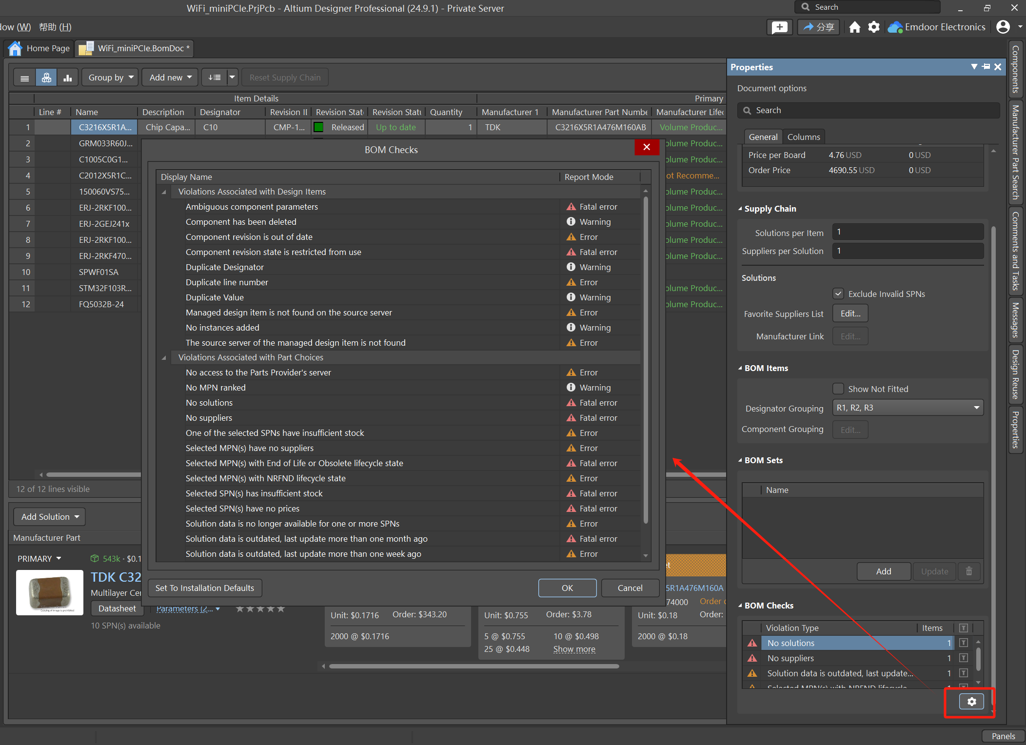 檢查每個BOM條目是否存在違規,檢查其狀態是否顯示在BOM Status列中。本列在BOM條目列表右側始終可見,并顯示表面該條目狀態的圖標。請注意,如果條目在多次BOM檢查中失敗,圖標顯示最嚴重的故障。