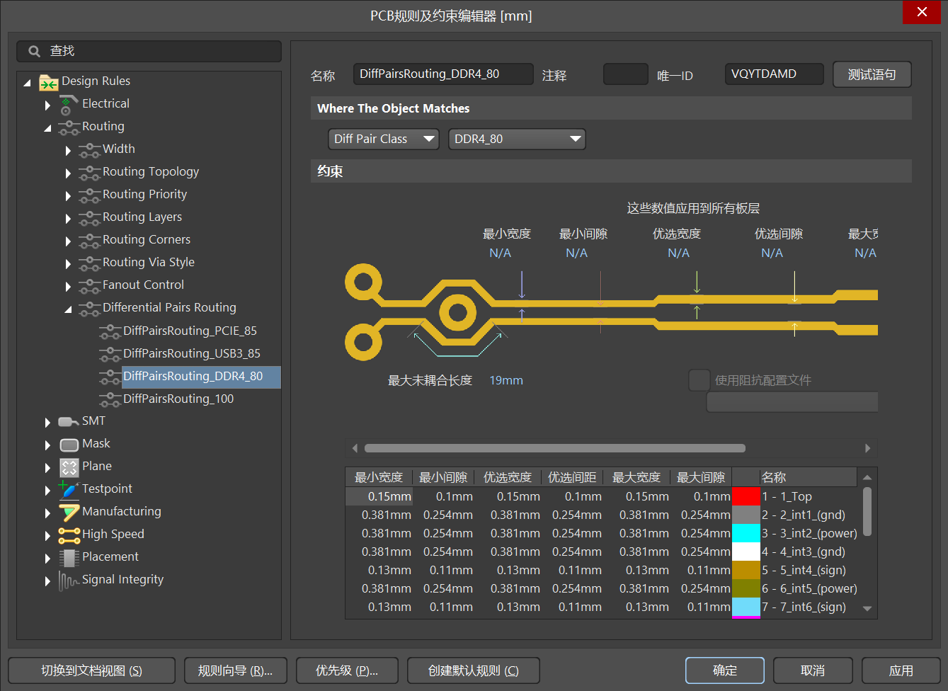 ■ 設置差分布線規則 :在 PCB 設計中,設置差分布線的布線規則,如線寬、線距、耦合長度等。可以通過在 “Rules” 面板中添加 “Differential Pair Routing” 規則來實現。