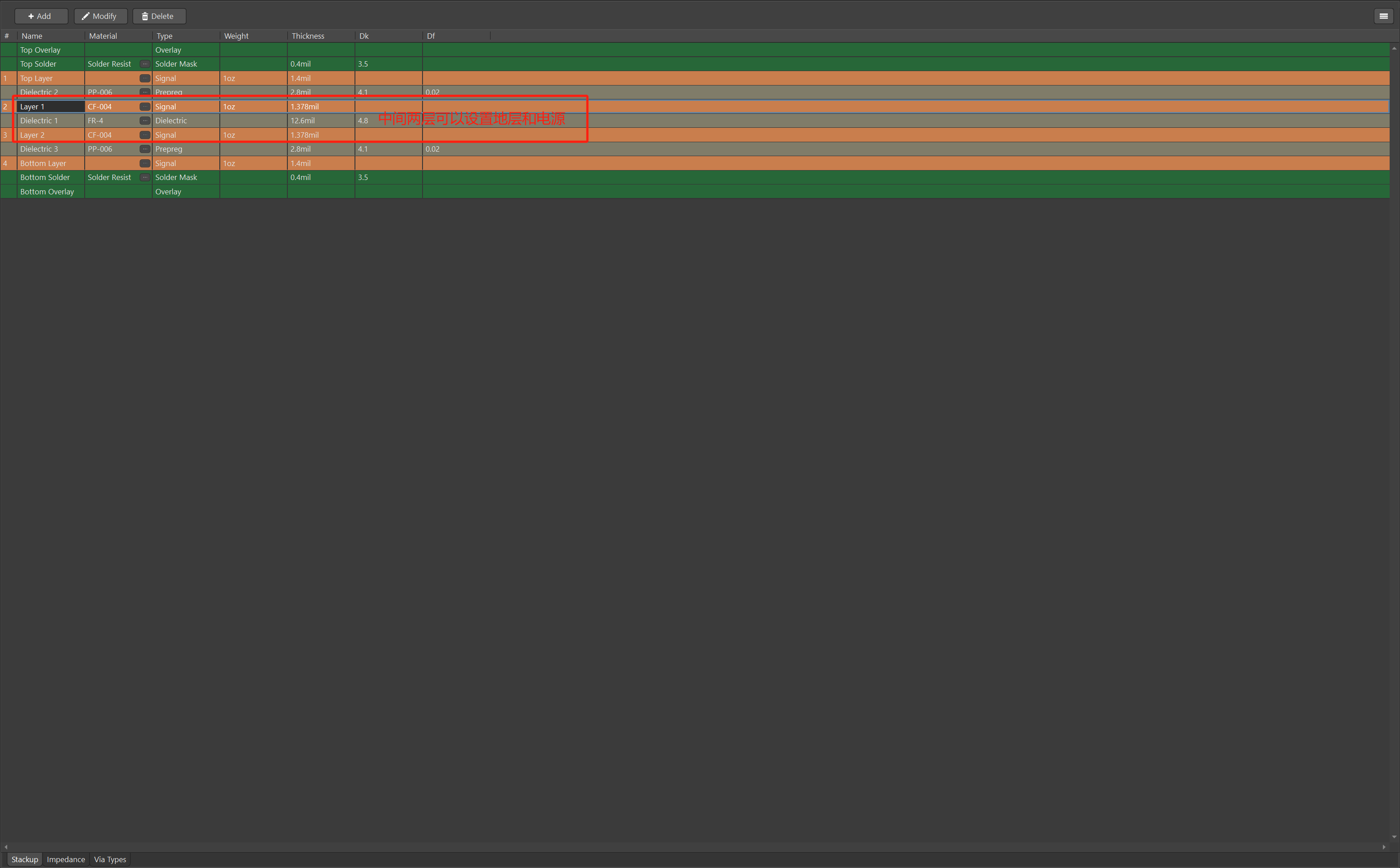 ■ 創建電源層和地層 :在 PCB 設計中,創建電源層和地層。可以通過在 “Layers” 面板中添加新的層來實現。和前文的創建屏蔽層其實類似,簡單來說就是屏蔽層可以用鋪銅連接地,電源層則是鋪銅全連接電源。