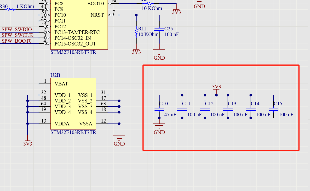 ■ 添加電源元件 :在原理圖設計中,添加電源元件,如電源芯片、電容等。可以通過在元件庫中選擇相應的元件并放置在原理圖中來實現。(圖中添加電容濾波)