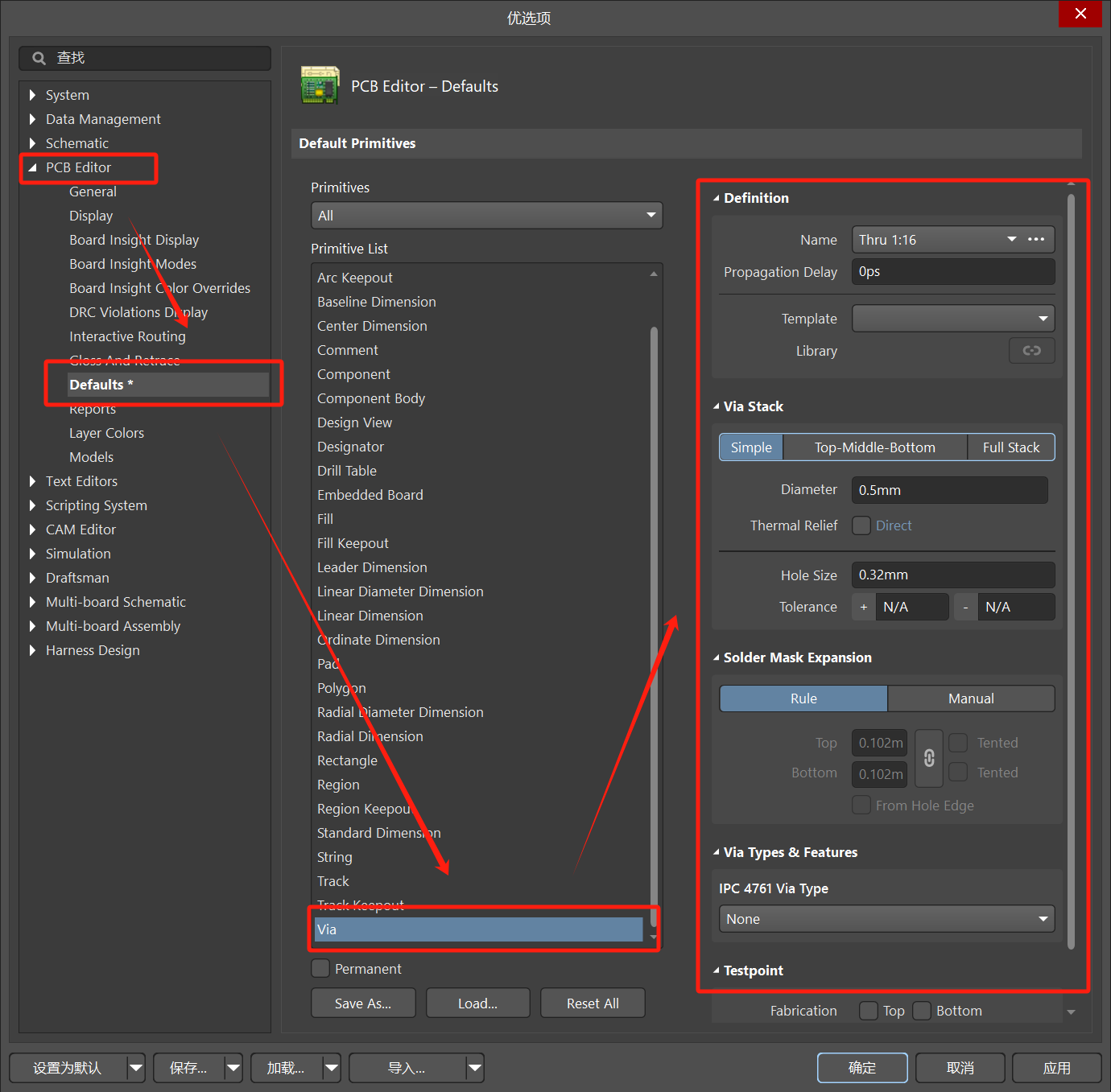 2. 在 “Via” 選項(xiàng)卡中,可以設(shè)置過孔的默認(rèn)孔徑、鍍層厚度等參數(shù)。