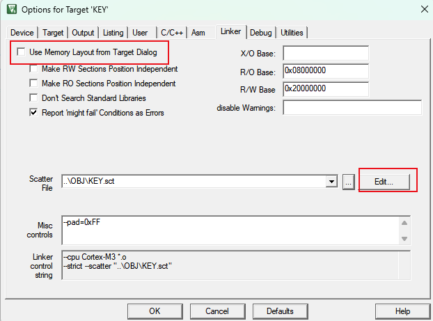 1)、首先,想要達成目的,需要對于散步(.sct)文件進行自定義修改。想要修改散步(.sct)文件需要在options->Linker中取消勾選Use Memory Layout from Target Dialog選項,然后,scatter file的Edit選項會使用,點擊就可以編輯散步(.sct)文件了。(如圖4-1)