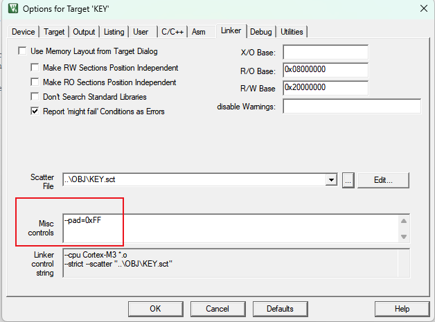 3)、如果想要對于空白區域的指定填充的數據的話,可以在option->Linker的Misc controls中輸入參數“-pad=num”來指定(如圖4-3)。建議指定0xff(注意:在某些情況下,未初始化的內存可能會包含隨機數據,這些數據可能會與程序中的預期數據發生沖突,導致程序運行不穩定或出現錯誤。通過填充0xFF,可以避免這種情況的發生)