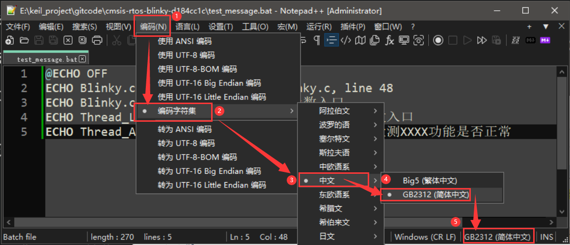 8)、接下來給該功能再完善一點,再上一步的圖中,我們發現了中文的痕跡,但是如果直接使用不做任何更改的bat文件,還是會報一堆亂碼,所以這時,需要我們在Notepad++中,更改bat文件的編碼格式,如圖9所示,更改完以后,對文件進行保存后,再回到keil中重新編譯一遍工程,即可出現正常的中文字符。