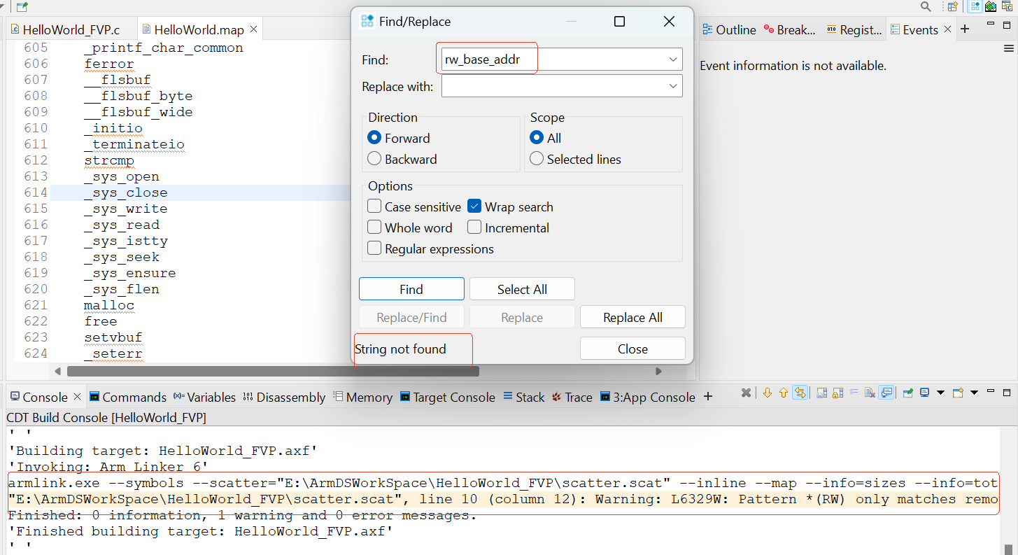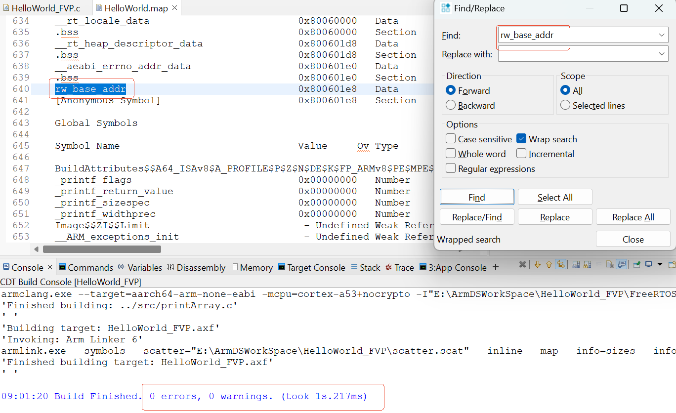 在main函數中用“static unsigned long rw_base_addr;”設置一個全局變量,在map文件無法找到這個變量名稱,同時,會出現“Warning: L6329W: Pattern *(RW) only matches removed unused sections.”的警告信息,如圖2-1所示: