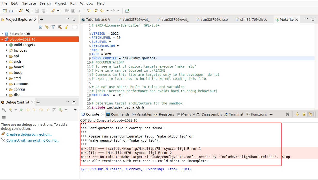 當(dāng)把Uboot導(dǎo)入ArmDS后,在編譯工程時,出現(xiàn)如圖2-1所示錯誤: