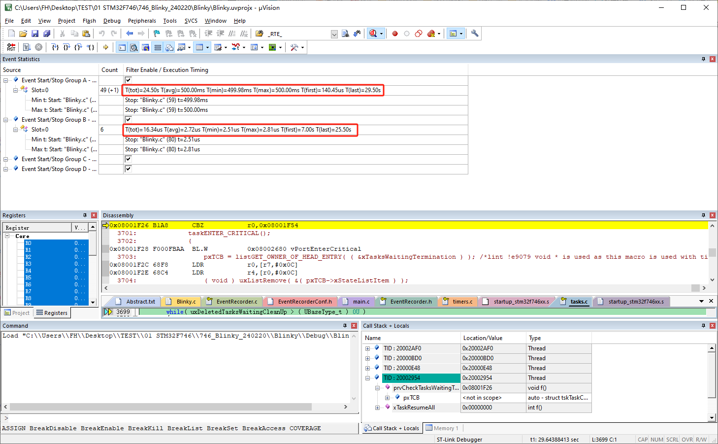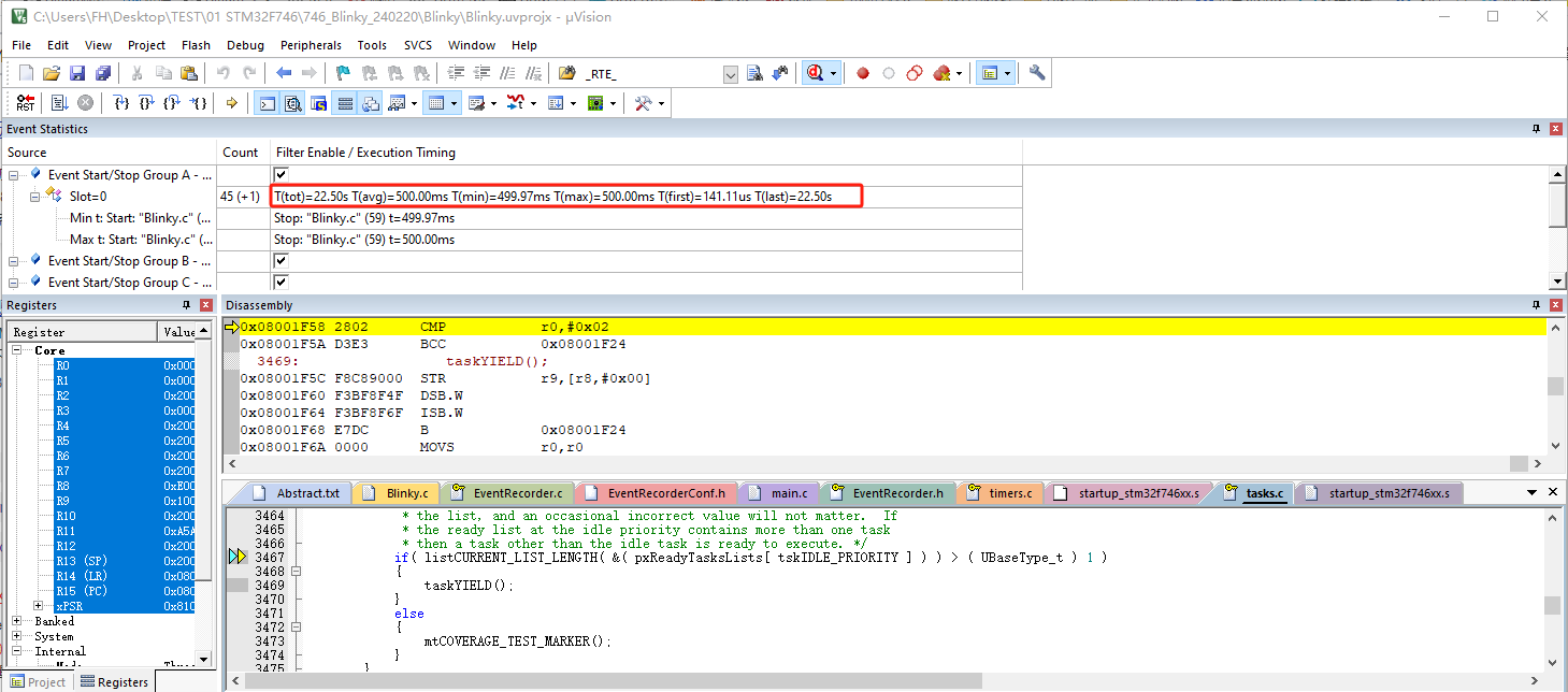 編譯完成后,進入調試界面,找到“Event Statistics”視圖,查看函數執行時間的平均值、最小值、最大值、開始時間和結束時間。