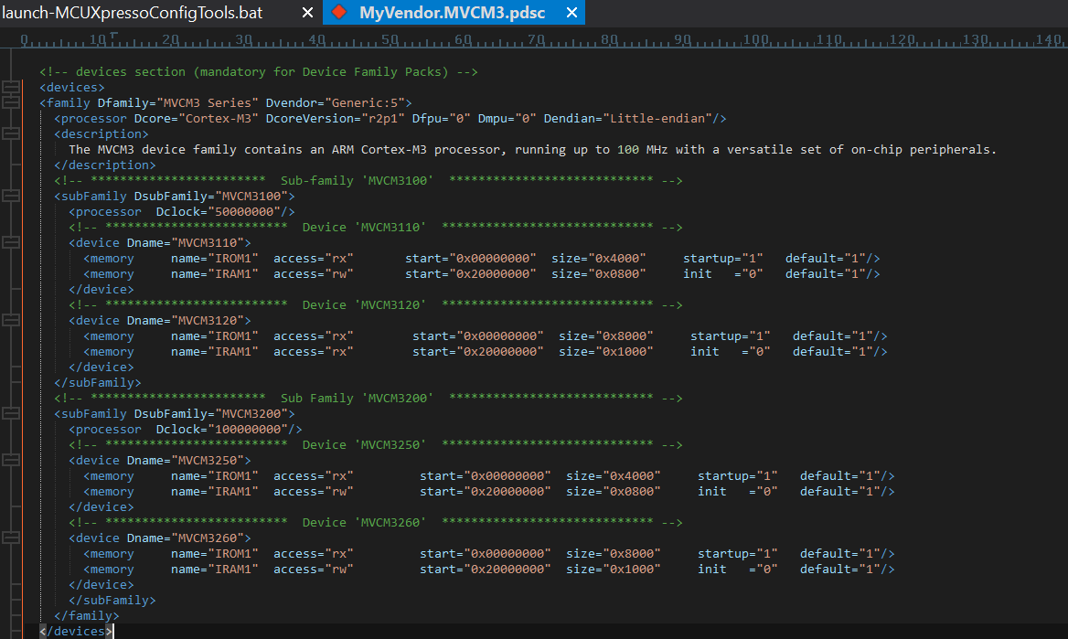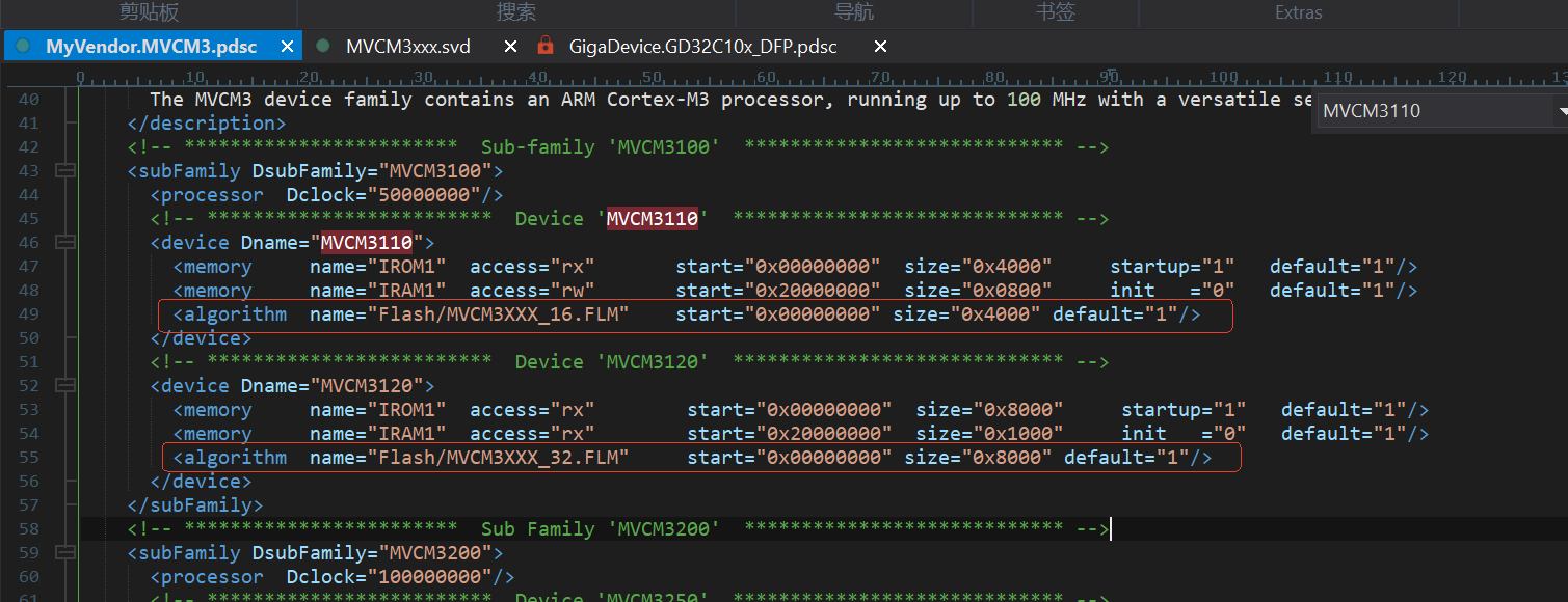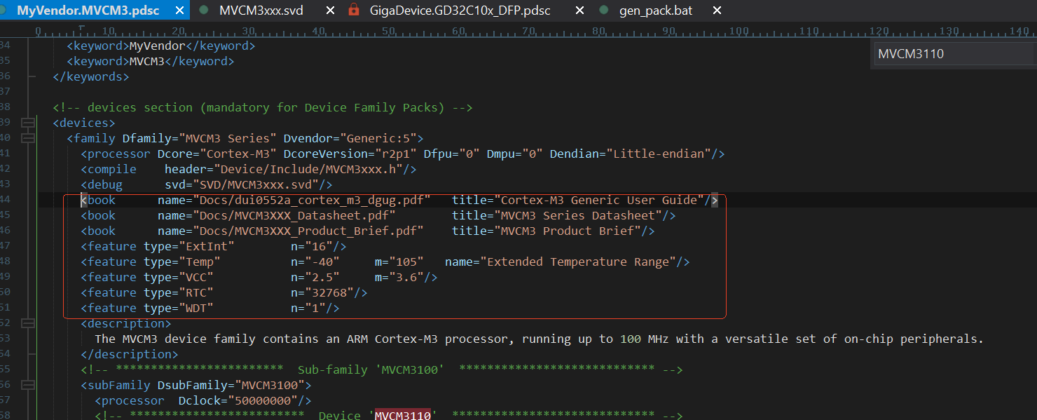 4. 打開(kāi)“MyVendor.MVCM3.pdsc”文本,在“<devices>”部分添加如下內(nèi)容,如圖3-3所示: