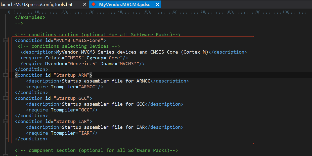 6. 在“MyVendor.MVCM3.pdsc”文件的<conditions>部分添加如下內(nèi)容,如圖3-5所示:
