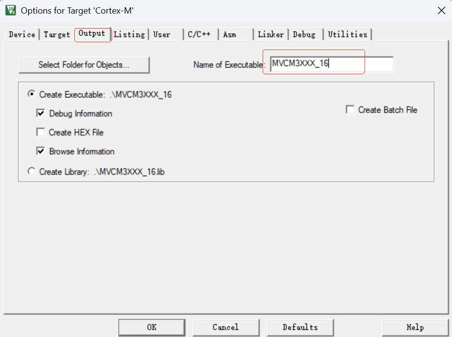 16. 打開(kāi)“MVCM3XXX_16.uvproj”工程,在選項(xiàng)配置的“Output”中,把執(zhí)行文件名稱修改為“MVCM3XXX_16”,如圖3-15所示: