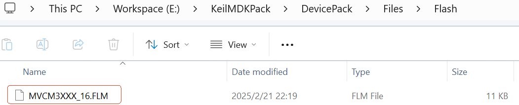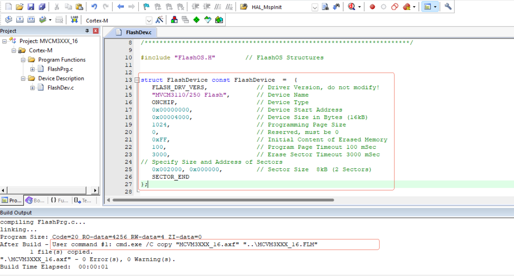 17. 在Keil MDK中修改“FlashDev.c”中的一個(gè)參數(shù),通過(guò)構(gòu)建工程創(chuàng)建“MVCM3XXX_16.FLM”文件(在具體芯片的PACK開(kāi)發(fā)中,需要調(diào)整FlashPrg.c文件中的編程算法。)如圖3-16所示: