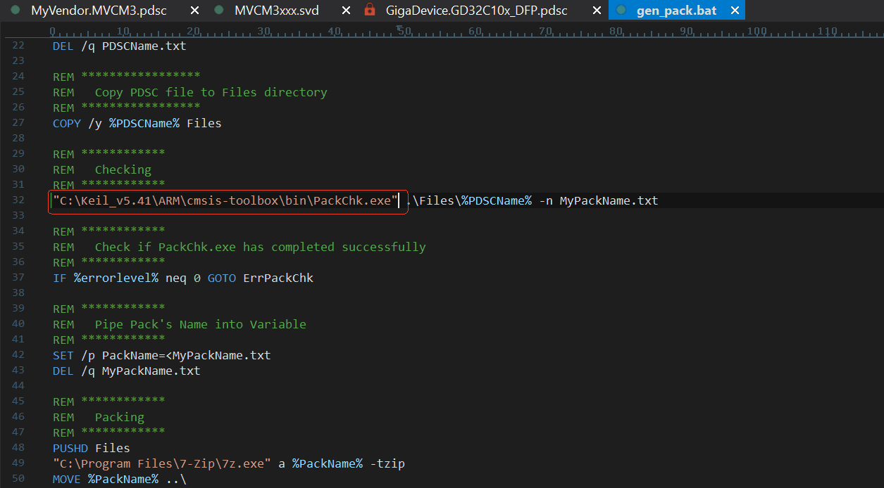26. 安裝解壓工具7-Zip ,打開(kāi)“gen_pack.bat”文件,修改“PackChk.exe”文件的路徑,如圖3-25所示: