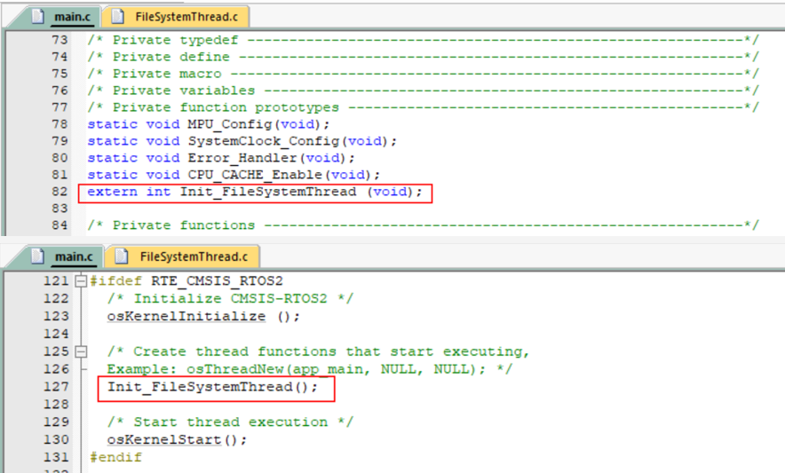 11. 在“main.c”中申明一下“Init_FileSystemThread”函數,并調用這個函數,如圖3-11所示: