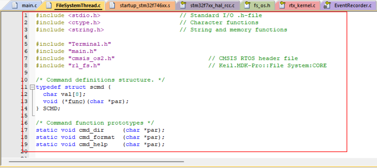 12. 打開“FileSystemThread.c”文件,添加與文件系統操作相關的代碼(由于代碼過多,參考實例代碼),如圖3-12所示: