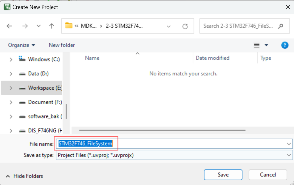 1. 打開uVision,創(chuàng)建一個(gè)名稱為:STM32F746_FileSystem的項(xiàng)目,如圖3-1所示:
