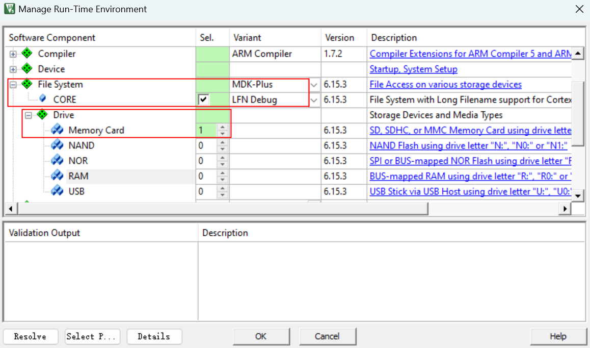 6. 選擇“File System-->CORE”,并設(shè)置“File System-->Drive-->Memory Card”組件,點(diǎn)擊“Resolve”完成相關(guān)組件的添加,如圖3-6所示: